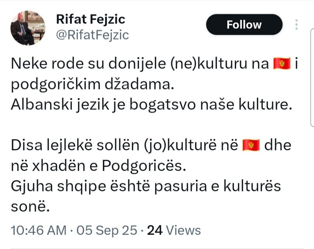“Neke rode su donijele (ne)kulturu na crnogorskim i podgoričkim džadama. Albanski jezik je bogatsvo naše kulture.” – objavio je putem svog naloga na platformi “X”.