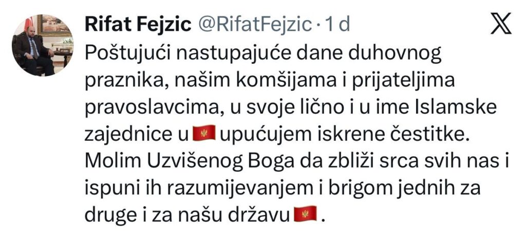 Reis Islamske zajednice u Crnoj Gori, Rifat ef. Fejzić, uputio je čestitku pravoslavnim vjernicima povodom nastupajućeg praznika, ističući važnost međusobnog poštovanja i razumijevanja.